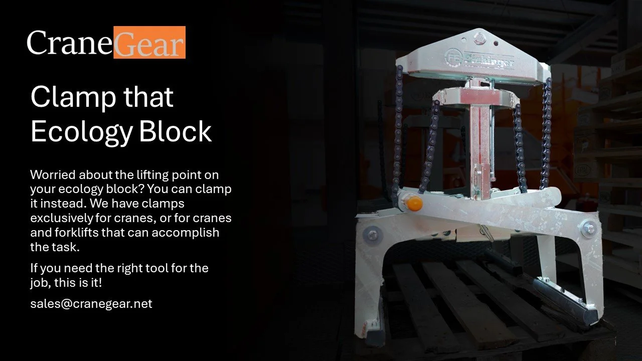 Finally a safe and efficient way to lift ecology blocks. My whole career was spend debating how to safely lift these. You shouldn’t lift by the eye’s repeatedly. Most manufacturers design them for three uses. From the form. To the truck. Then into place. These are the common three lift ratings. So do you lift it by the hook just some and put slings on? Which slings since you have the sharp edges? Our 1567 ends these debates. It’s ASME Rated to grab them by the sides with automation. If you’ve ever used a jersey barrier (k rail) clamp, these function exactly the same. Quick and easy every time. Grab the only legal way to lift ecology blocks with Eichinger and Crane Gear.